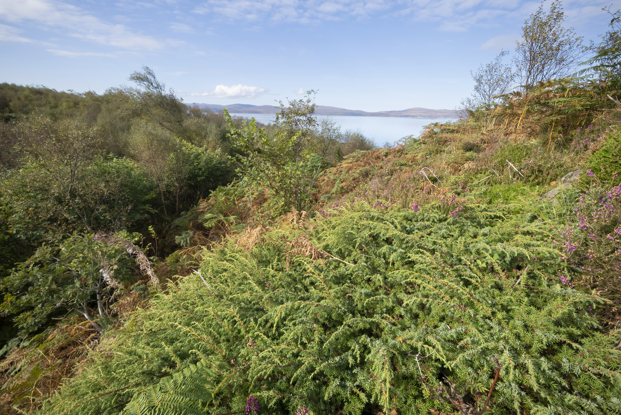 Native Highland cattle graze long-deserted hills and an area of a recently felled commercial plantation on this site in the Knapdale National Scenic Area – overlooking the Sound of Jura. Bracken and rushes blanket the hills and valleys every summer and self-sown birch, alder and willow are fast closing over the rotting stumps of plantation trees that were harvested in 2005. The low-intensity, non-selective cattle grazing is already helping to create a more diverse and stable habitat.