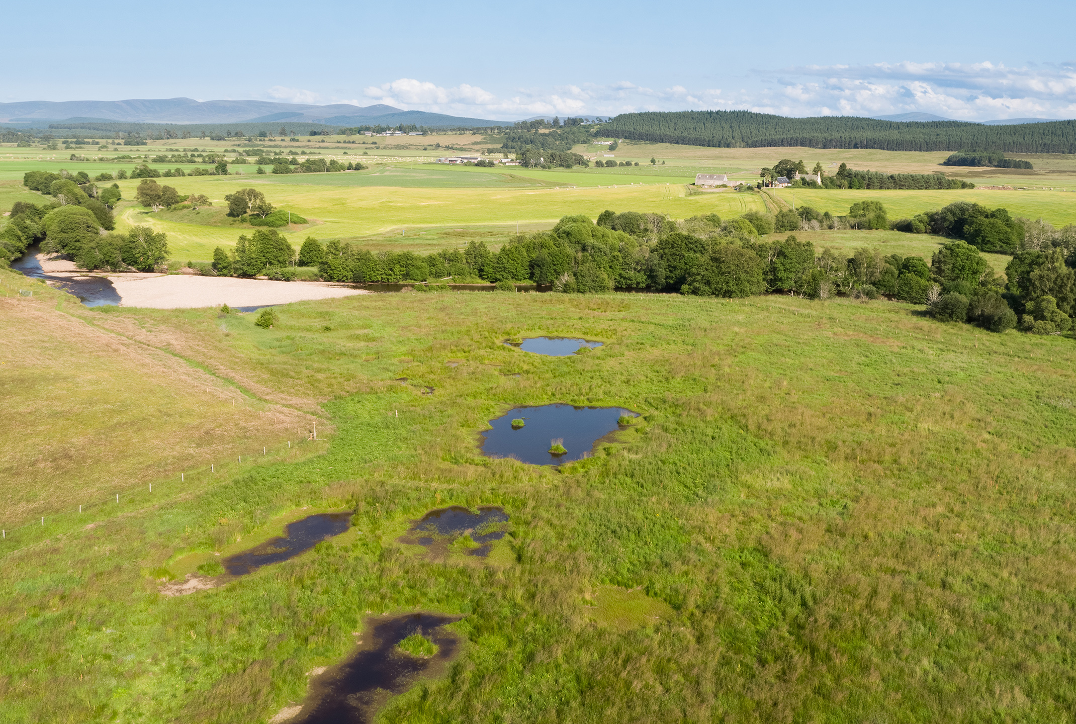 Situated in the fertile floodplain of the River Dulnain in the Cairngorms National Park, this recently acquired land has been farmed for generations, most recently as grazing pasture for sheep. Bordered by the river, an extensive wetland, and both pine and broadleaved woodland, the new habitats being created on the farm have the potential to become important wildlife corridors connecting existing wildlife habitats.