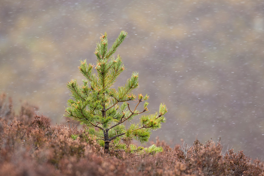 Carrachan occupies a dramatic setting, defined by open water, peatland and rugged moor, looking south across Loch Shin. The landholding includes a varied loch margin which, at lower water levels, reveals stony and gravelly foreshore habitat. Above the shore, the ground transitions into mixed semi-natural woodland and areas of scrub, interspersed with regenerating birch and scattered rowan. Further upslope, the land opens into heather-dominated moorland and wet heath, underlain by peat soils. Several small drains and ephemeral burns cross the holding, their flow fluctuating with seasonal rainfall before discharging into the loch. Browsing pressure from a substantial population of sika and red deer requires ongoing management to ensure successful woodland establishment and long- term ecological resilience.