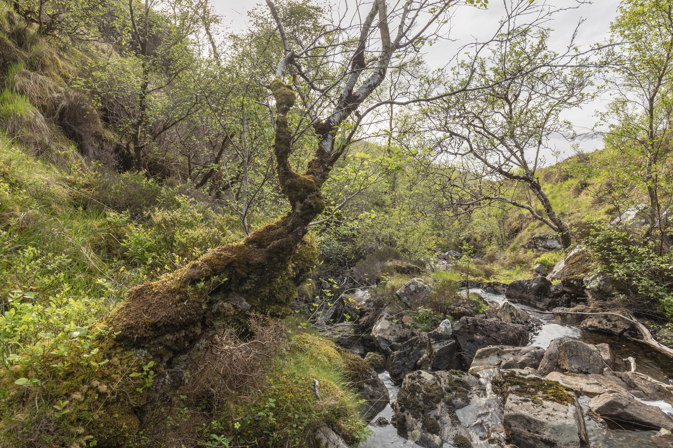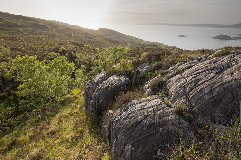 Dubh Allt is situated in on the rugged Moidart coast with a sea view towards the Isles of Eigg, Rum and Skye. At lower elevation, ancient birchwoods, oak and Scots pine persist among rocky outcrops, but are struggling to regenerate in face of grazing pressure and the ubiquitous rhododendron ponticum. Higher up, on the hill tops, the red deer live in a challenging landscape of heather moorland, lochans and rocky gullies harbouring scattered patches of surviving birch.