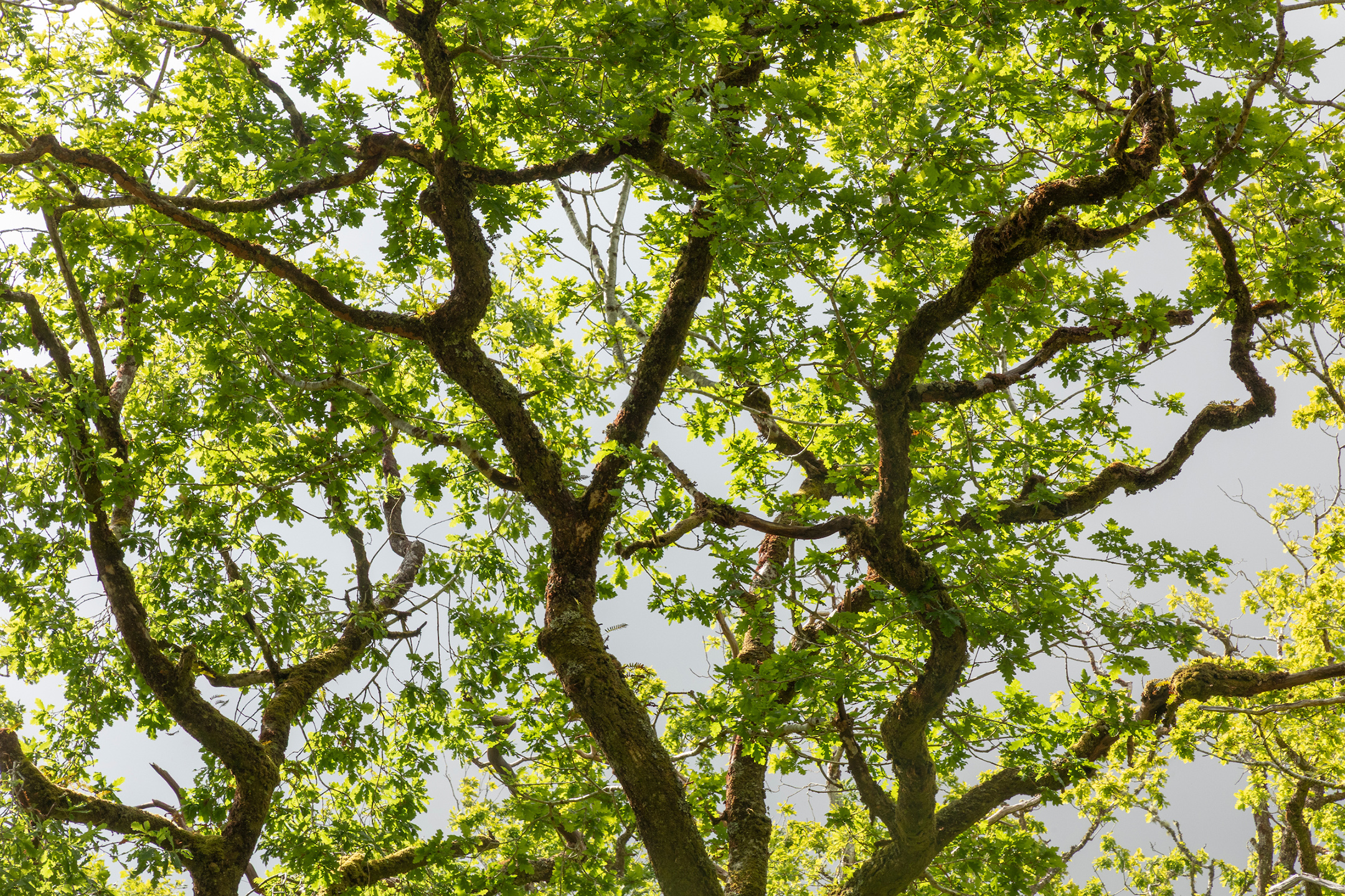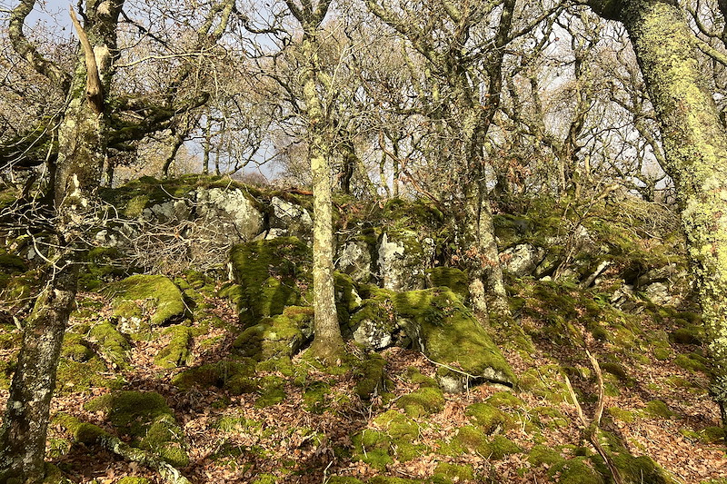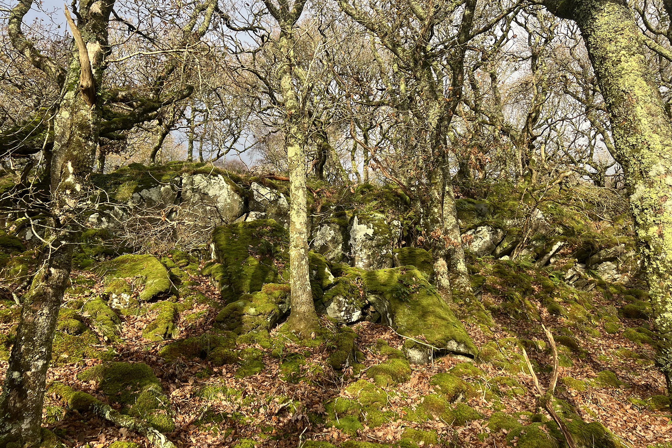 from the far side of West Loch Tarbert. Oak is the dominant tree species, but the wood also holds substantial stands of hazel, birch and willow, threaded throughout with holly and rowan. Thanks to the typically high rainfall and humidity of the west coast, the woodland is rich with remarkable lichens, liverworts, mosses and epiphytic ferns. As in much of Scotland’s rainforest, non-native rhododendron has taken hold here, though the wood’s owners have made admirable progress in controlling it.