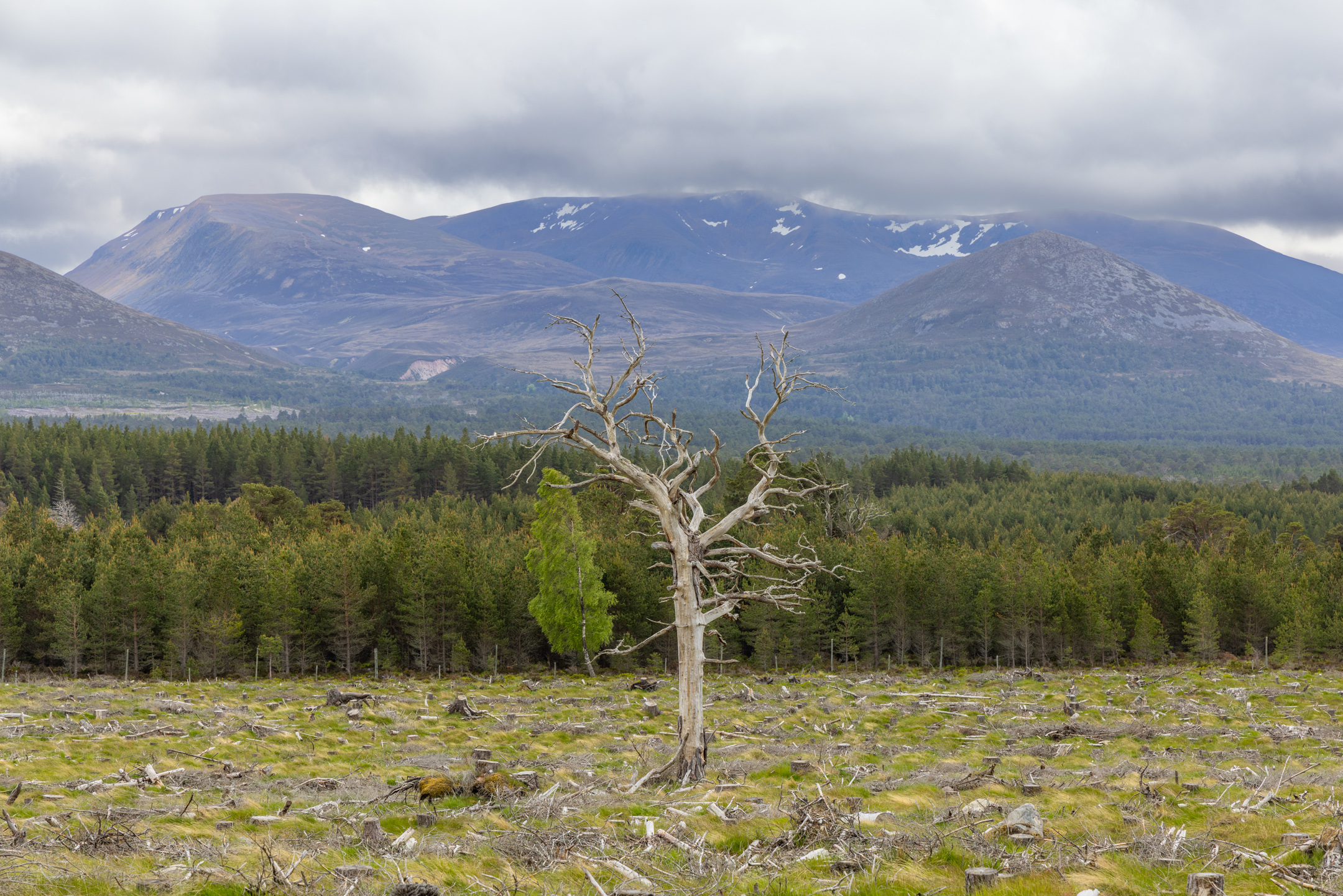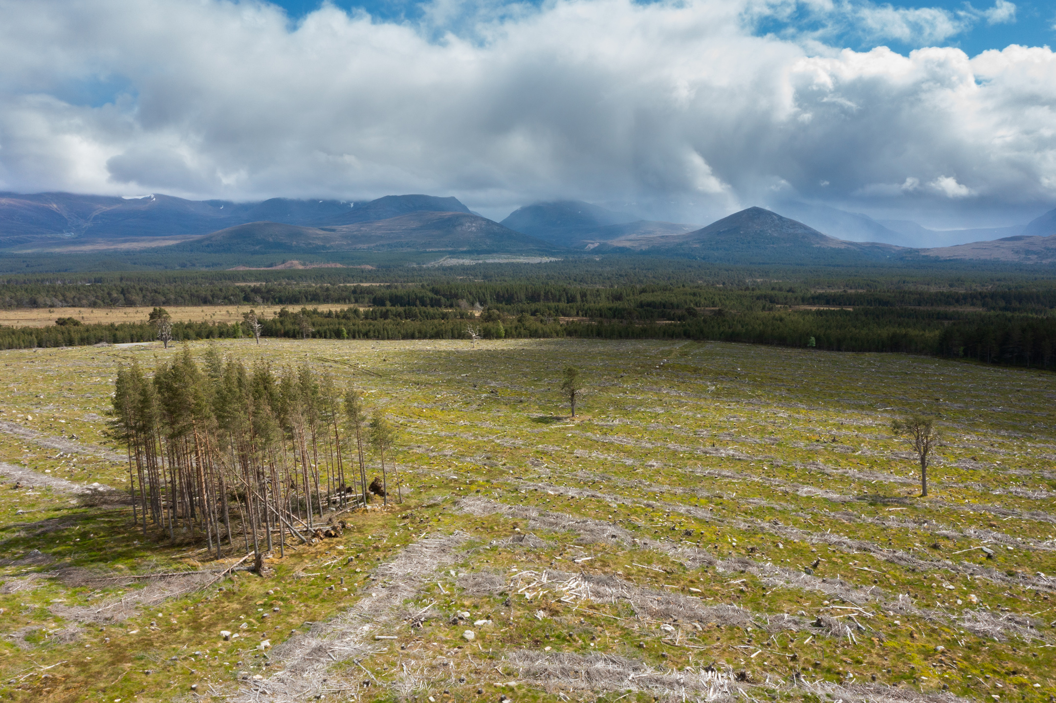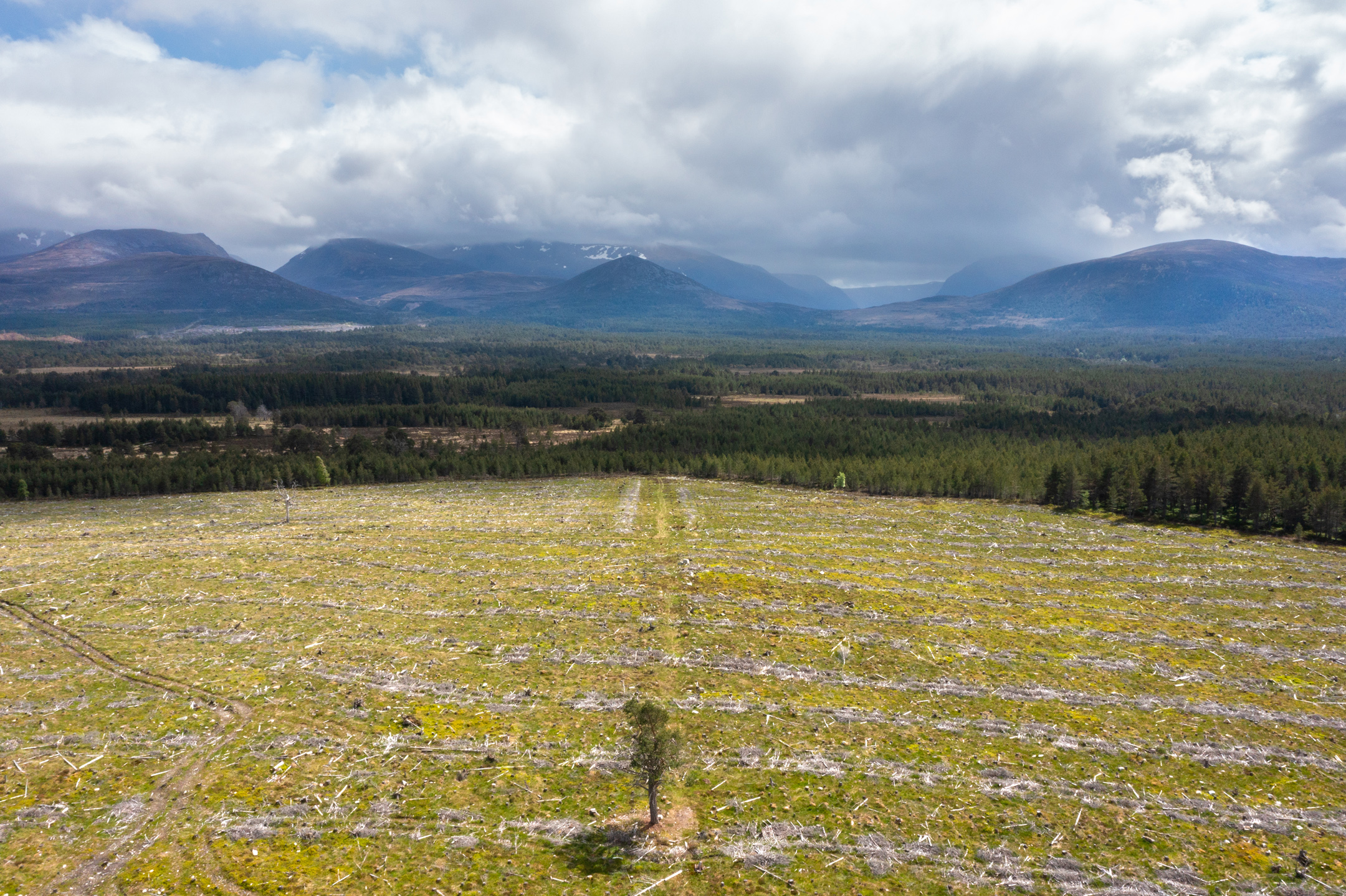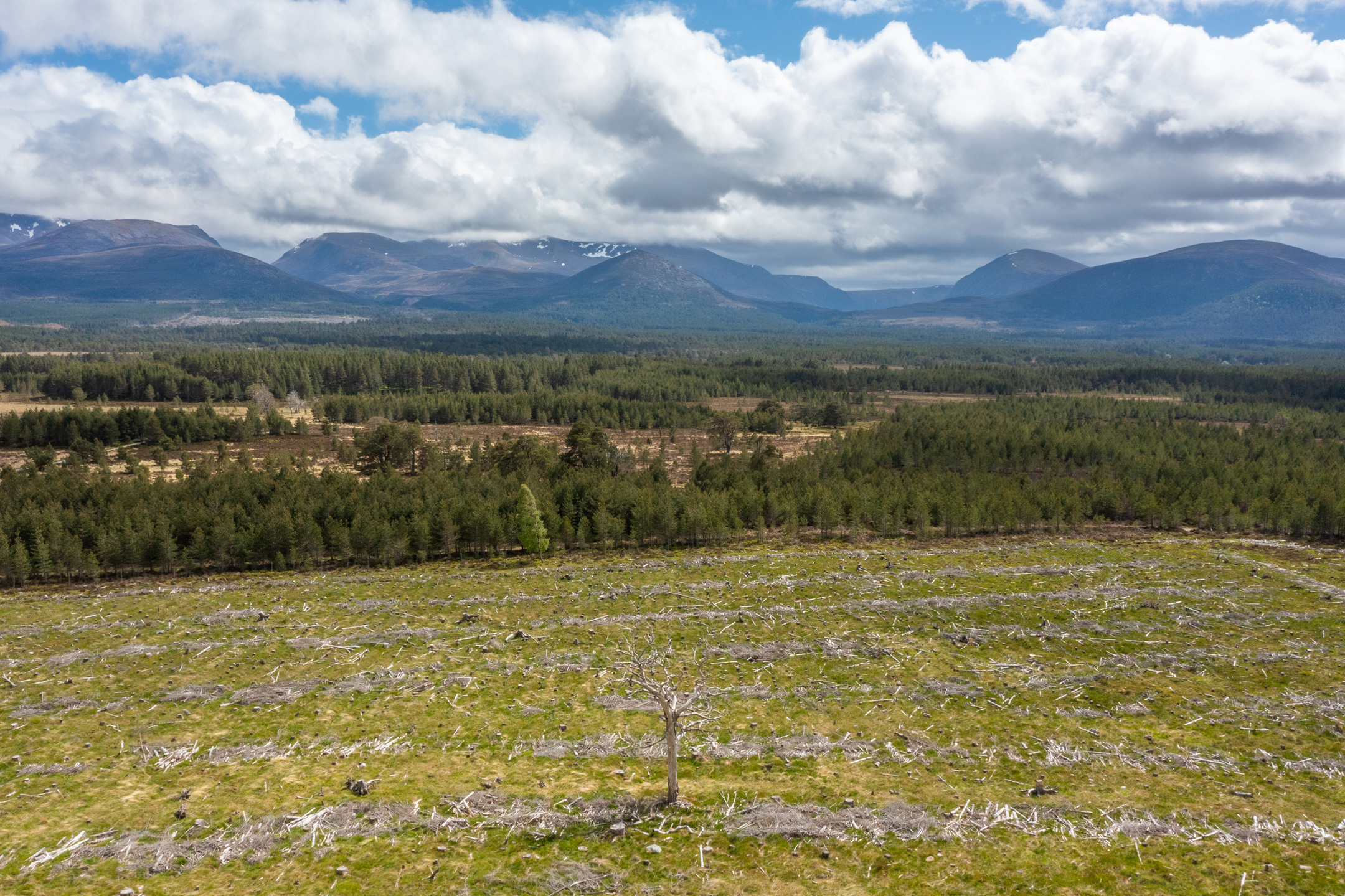 Moormore Woodland is a 63-acre site of recently felled commercial plantation within the Cairngorms National Park, which once formed part of the Caledonian Pine Forest of Rothiemurchus. From its slightly raised position, it provides a magnificent view of the surrounding Grampian mountains. Surviving ‘granny pines’, bleached by years of light deprivation, are testament to an earlier, less managed landscape. They provide both inspiration for rewilding and a seed source for the woodland regeneration in the years to come.