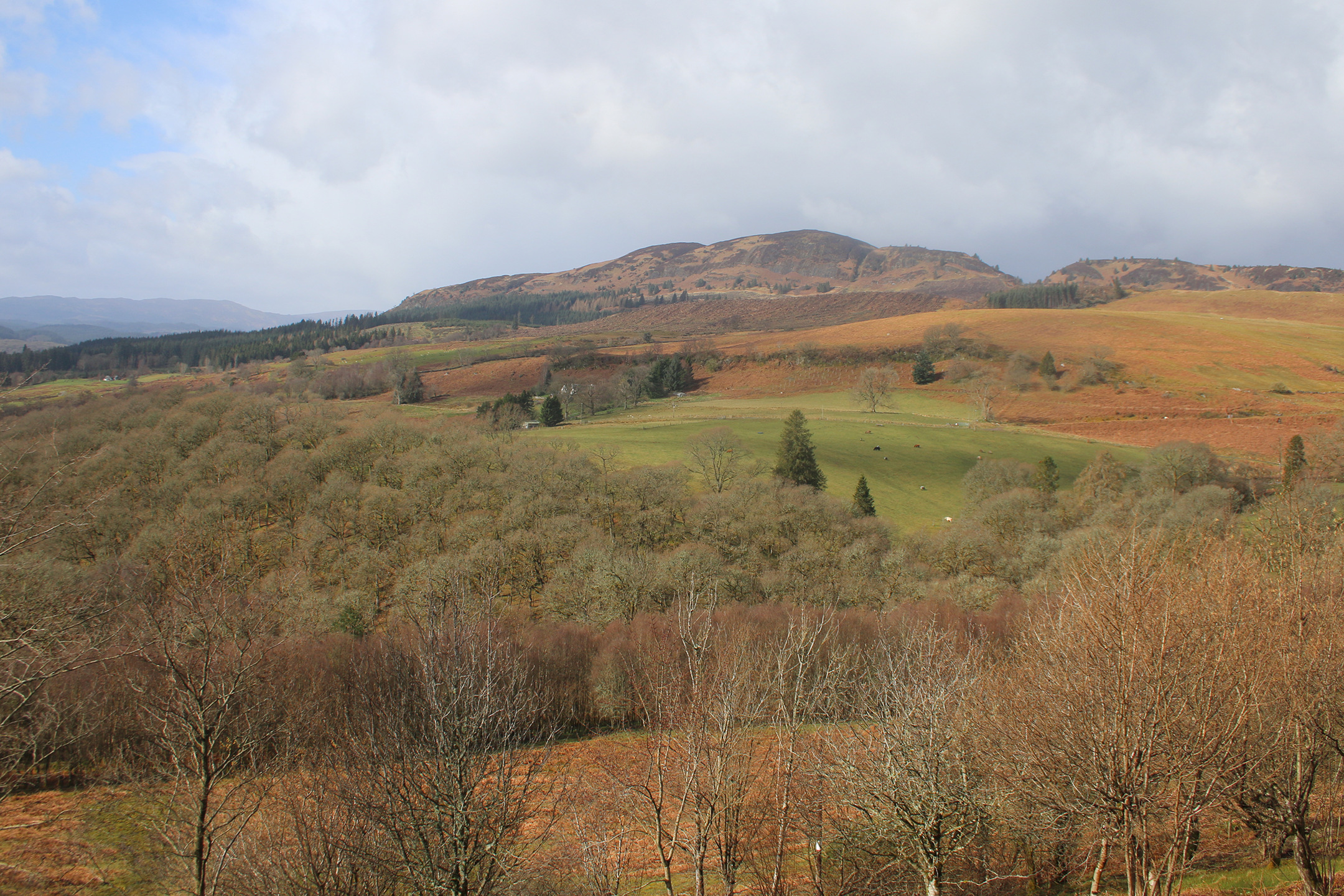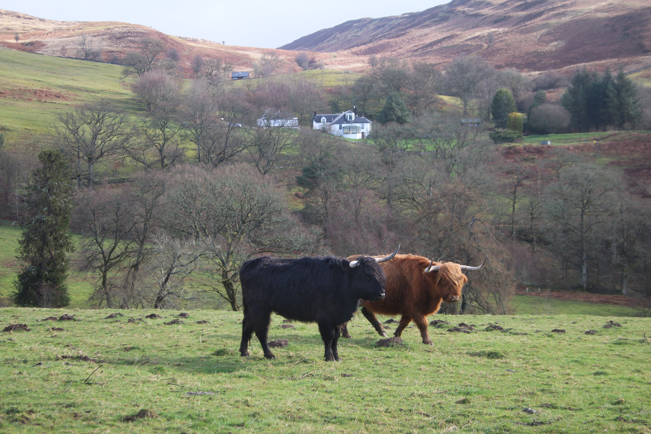 Netherglenny Farm lies in a hidden glen in the Monteith Hills, with panoramic views over the Lake of Monteith. The site is both a working farm and operates as a successful agri-tourism enterprise with self-catering cottages and a bothy. The highland cross cattle provide income, but also help restore ecosystem processes by breaking up the bracken, disturbing the soil, and increasing the number of invertebrates on site.