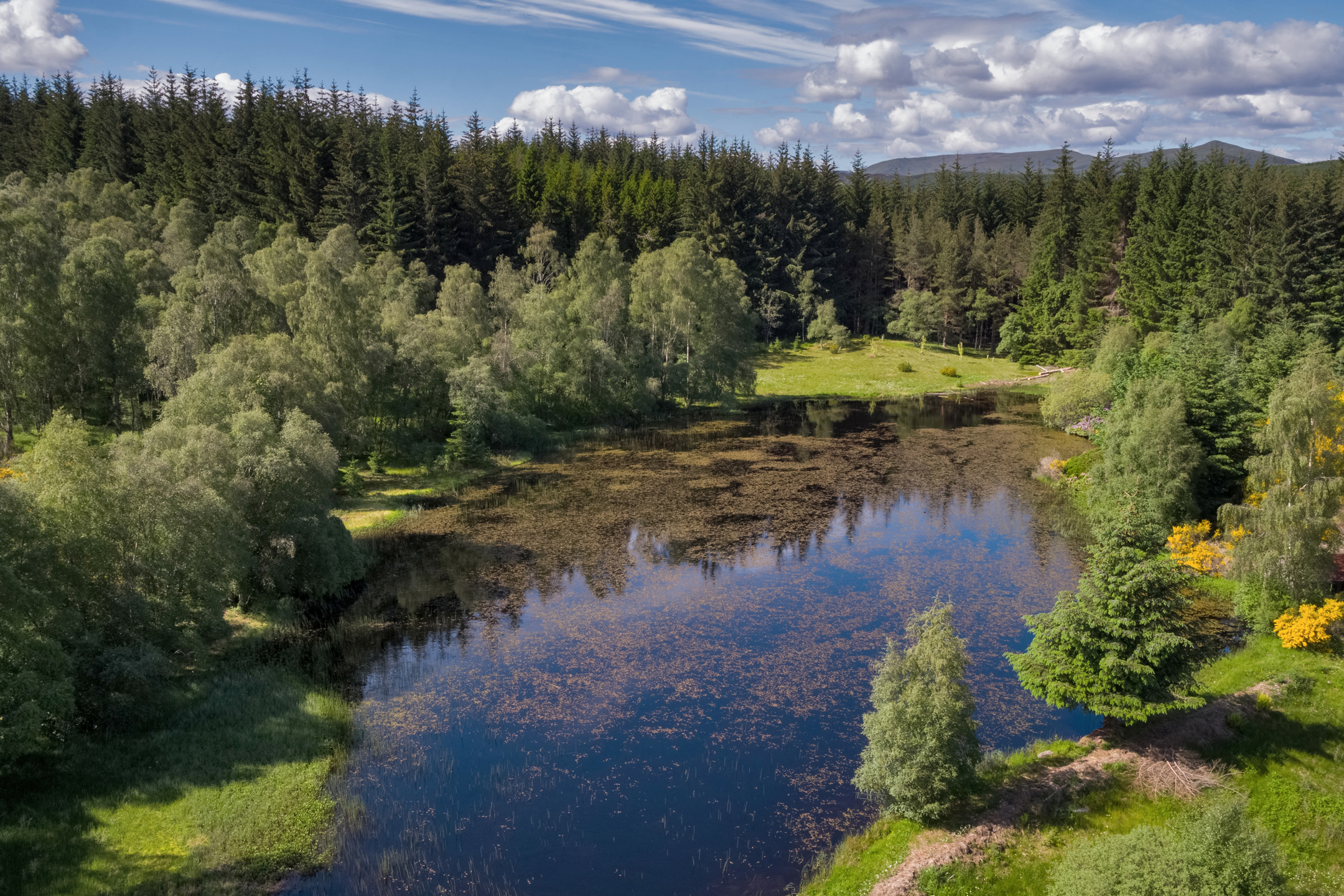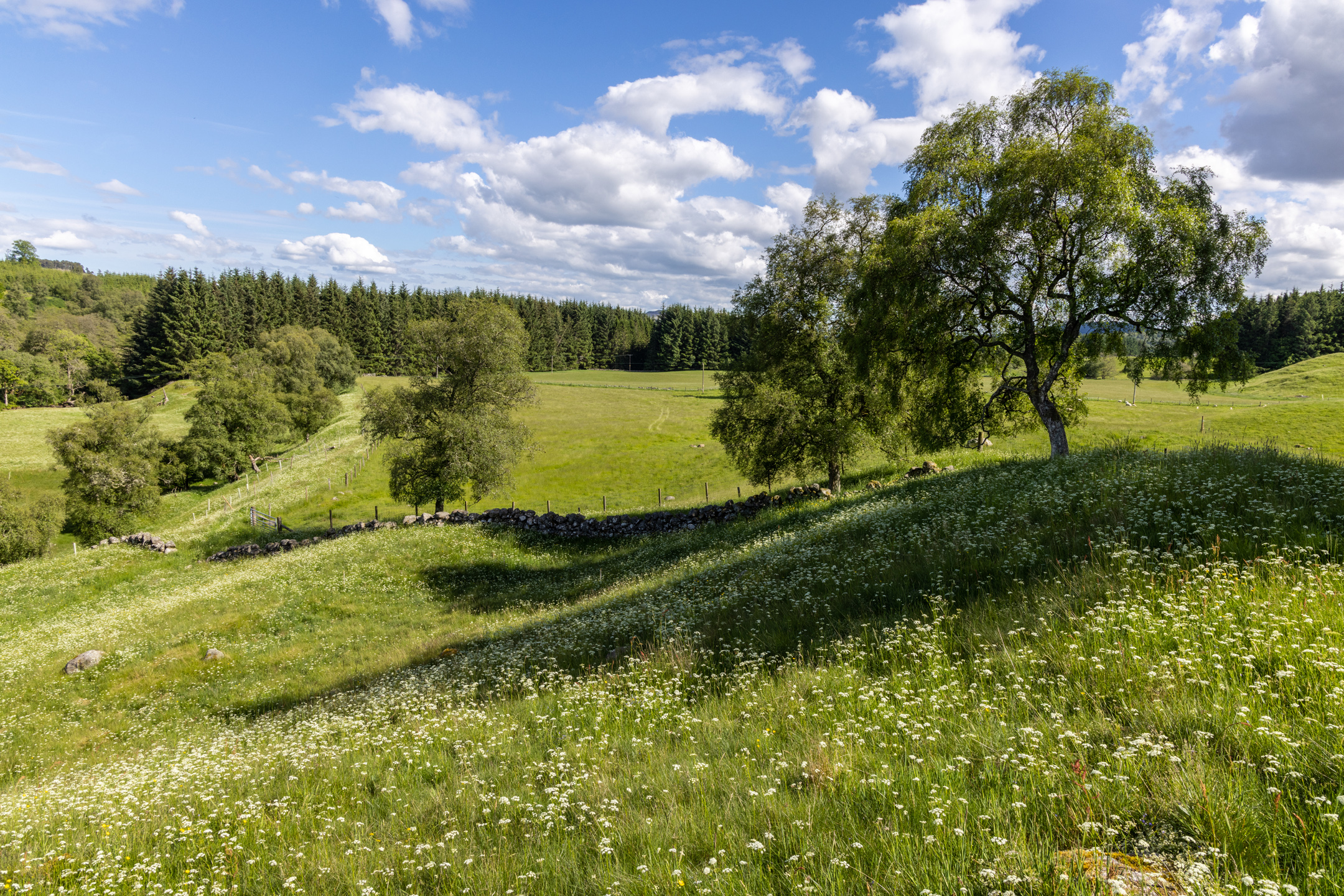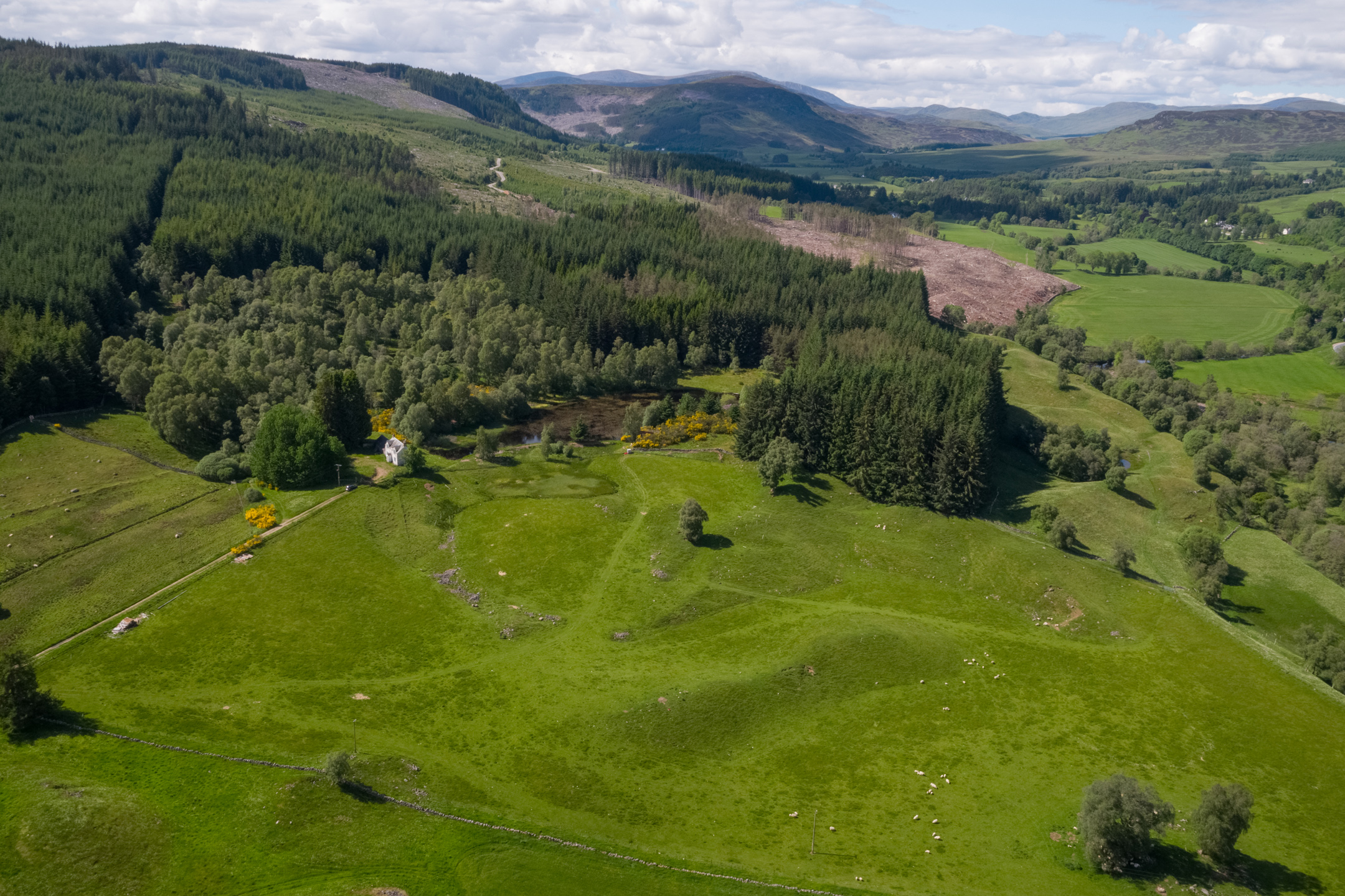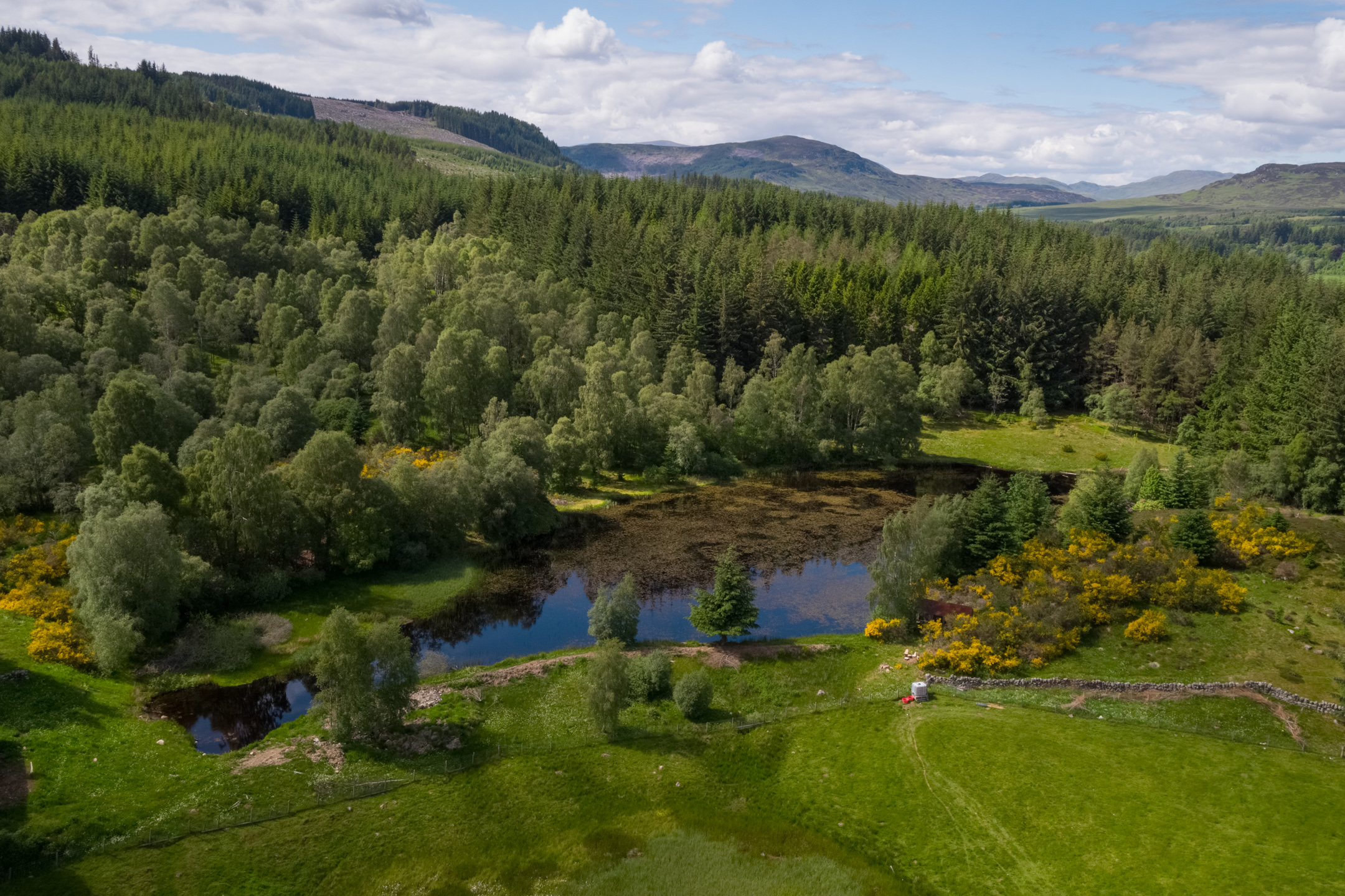 Wester Tullochcurran sits on the west bank of the tumbling River Ardle in northern Perthshire. Riparian alder, birch and willow give way to unimproved meadow above the valley wall, as well as sheep pasture, a small conifer plantation and further birch woodland. There is a lochan, ponds and the remains of a number of ‘ferm toun’ homesteads and field boundaries – illustrating the history of agriculture on the site.