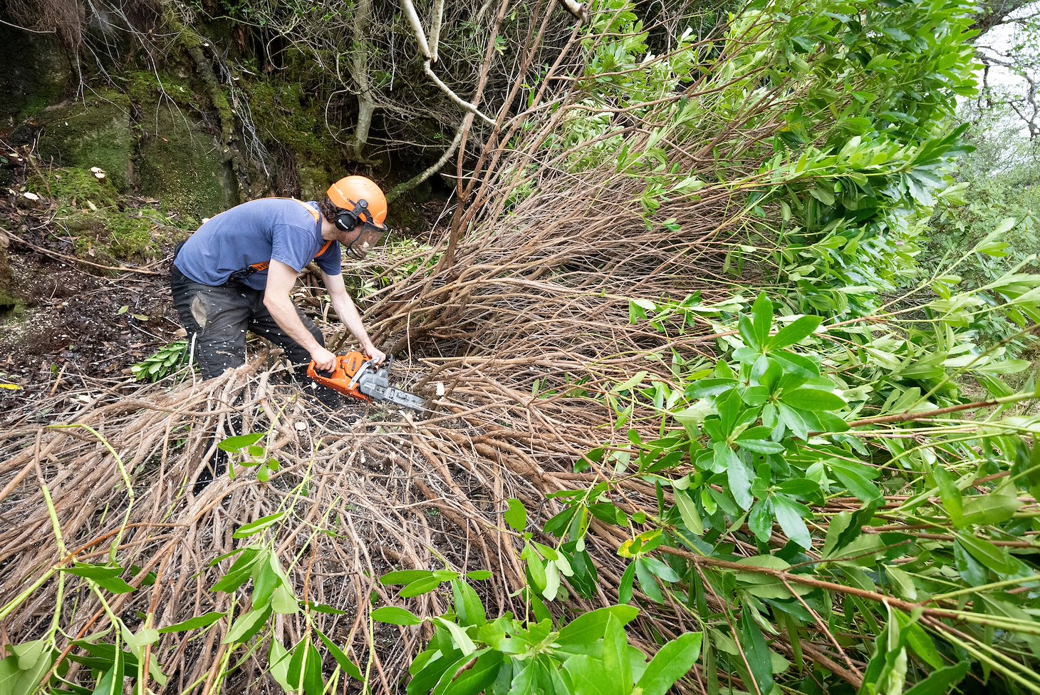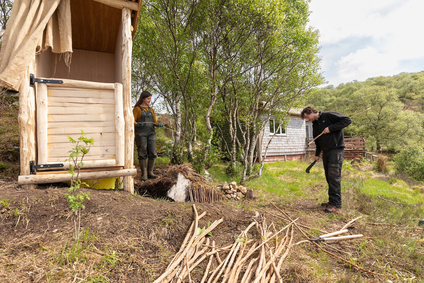 More settled times at Allt Dubh, clearing rhododendron to restore native woodland, crafting local wood and building a composting toilet.